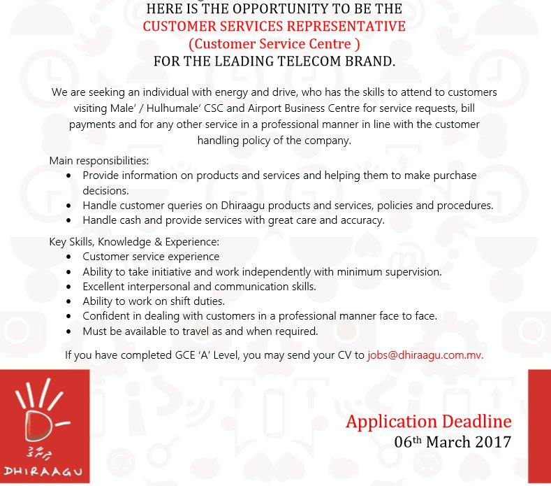 Dhiraagu On Twitter Here Is The Opportunity To Be The Customer Services Representative Customer Service Centre For The Leading Telecom Brand Https T Co Udkocxejtj Twitter